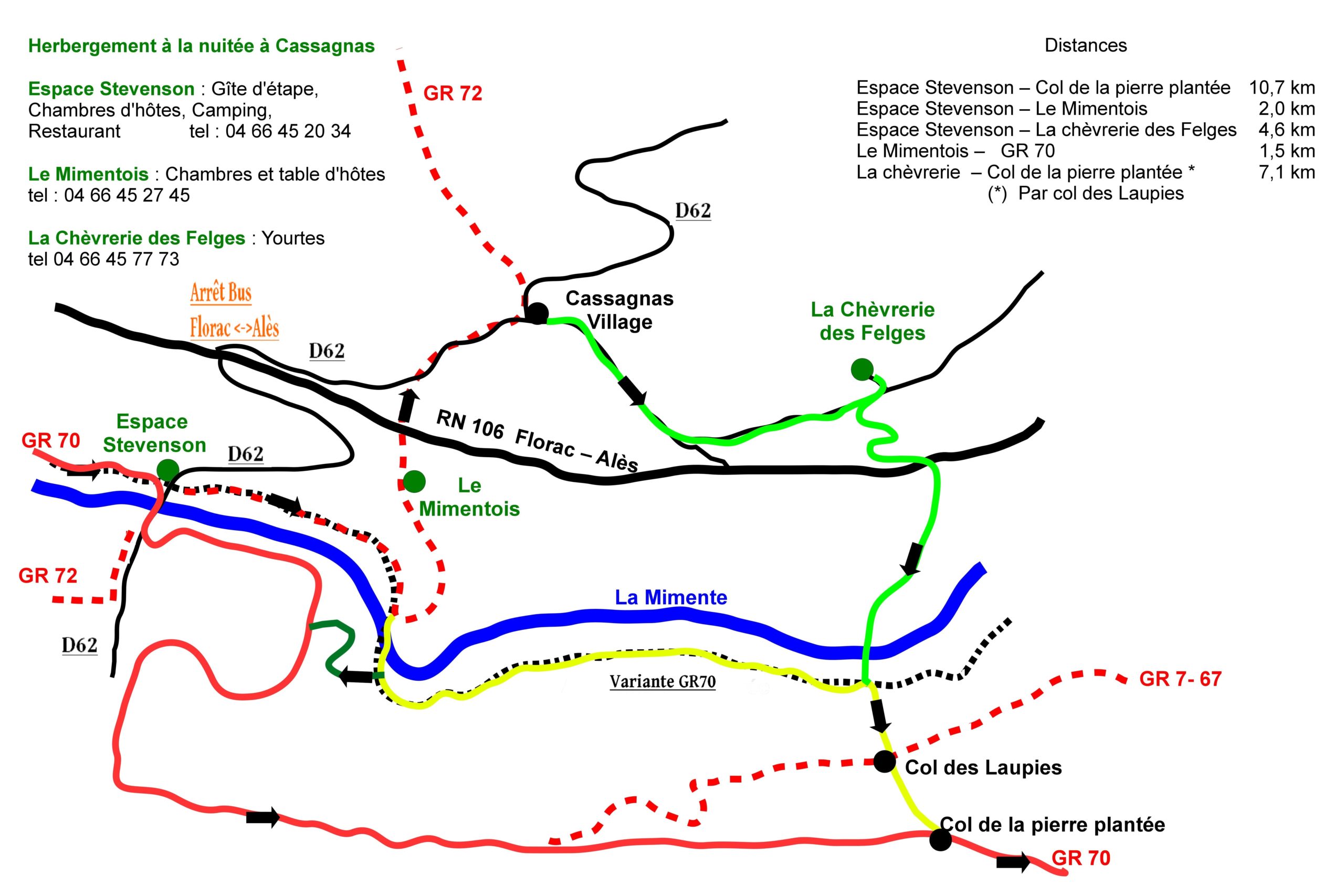 Vous arrivez du Pont de Montvert par le GR72 , à la sortie du village de Cassagnas, empruntez la passerelle métallique traversant la Nationale 106. Nous nous trouvons à gauche après la passerelle.